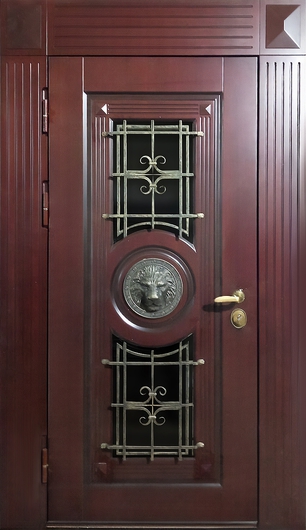 Стальная термодверь с отделкой МДФ, остеклением и решеткой, оформленная чеканным декором Лев Арт-1